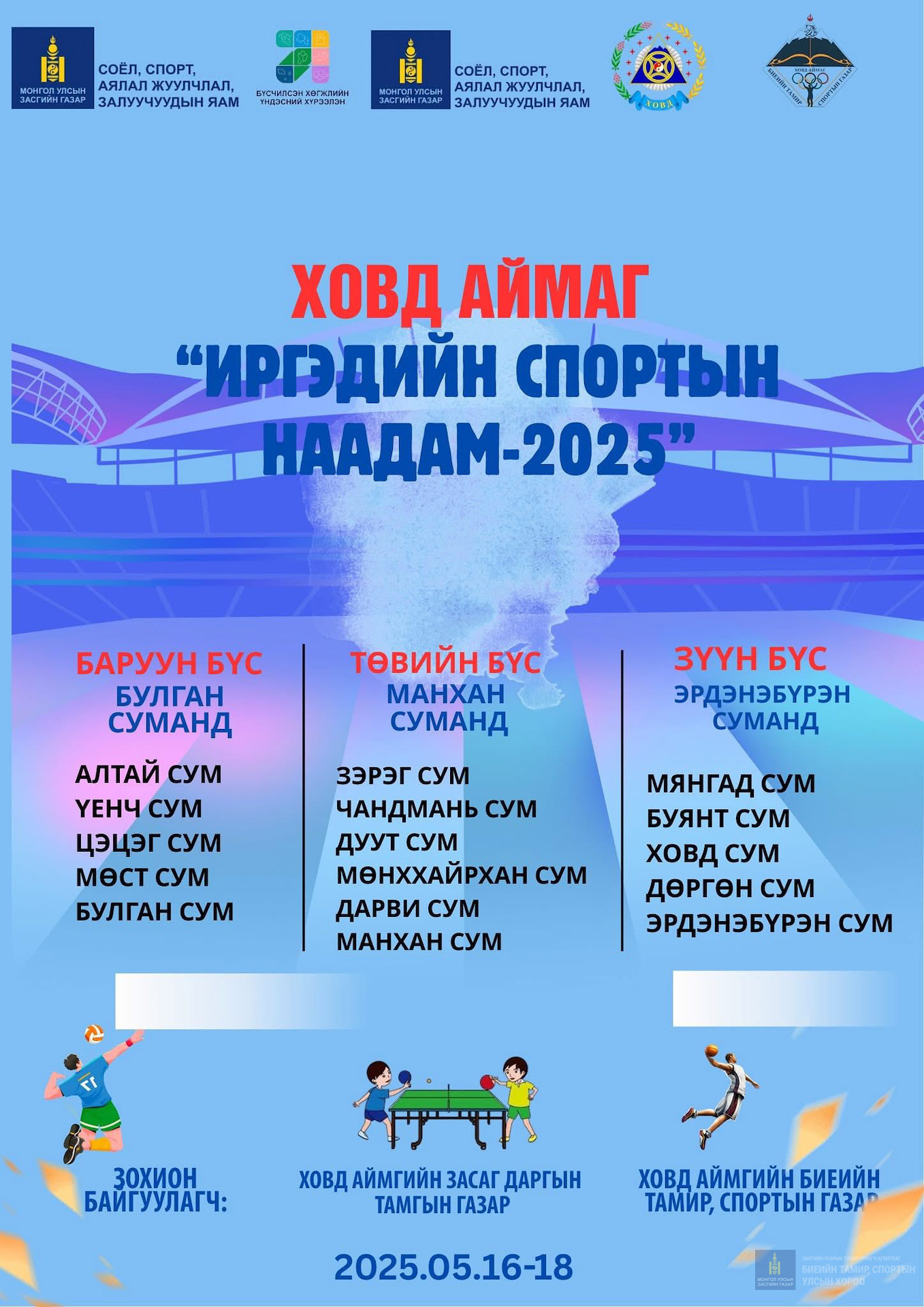 Монгол улсын бүсчилсэн хөгжлийн үзэл баримтлалд нийцүүлэн иргэдийн спортын их наадмыг спортын 7 төрлөөр 2025 оны 03 сарын 28 ны өдрөөс 06 сарын 30 ны өдрийн хооронд 4 үе шаттайгаар улсын хэмжээнд зохион байгуулахаар шийдвэрлэснээр Ховд аймгийн Засаг даргын зарирамж гарч 05 сарын 16 наас эхлэн сумдыг бүсчилсэн хэлбэрээр БТСГ- ын газрын ажлын хэсэг, бие бүрэлдэхүүн тухайн сумдын Засаг даргын тамгын газар холбогдох спортын нэгжүүдтэй хамтран зохион байгуулж дууслаа. Байгууллагын залуучууд ,дасгалжуулагч мэргэжилтнүүд маань шуурхай , ажил хэрэгч байдлаар газар дээр нь бүсийн тэмцээн болсон сумуудад ажиллаа.Хамтран зохион байгуулсан сумдын засаг дарга нар болон спортын ордон , сумдын арга зүйчид мэргэжилтэн нартай гүн талархал илэрхийлье.